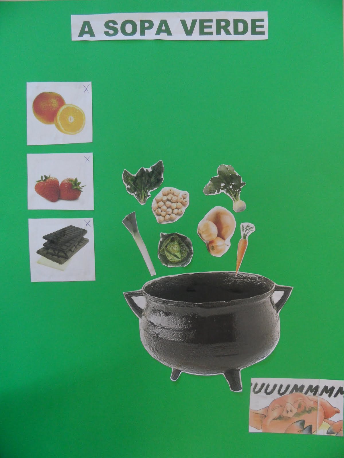 No final da história, a professora Anabela resumiu numa folha verde, toda a história. Aprendemos que a sopa de laranja, de morango e de chocolate não servem para comer e nem são saborosas. A melhor sopa é a sopa verde, aquela que leva a couve, o alho francês, os espinafres, o nabo, ... .