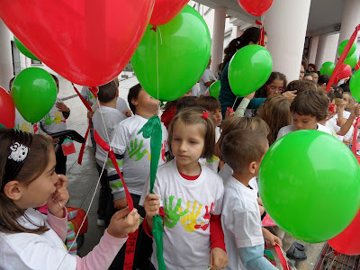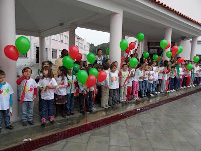 Depois deram-nos balões vermelhos e verdes (as cores da bandeira) e todos tinham uma fita. A fita que fizemos na sala é aquela que a Ana Miguel tem na mão. É uma fita amarela que tinha escrito o nome do nosso Jardim-de-Infância e o nome de todos os meninos e meninas.Clica para aumentar