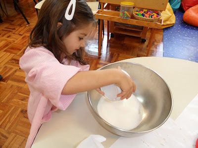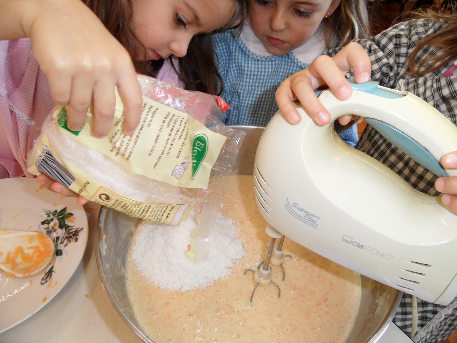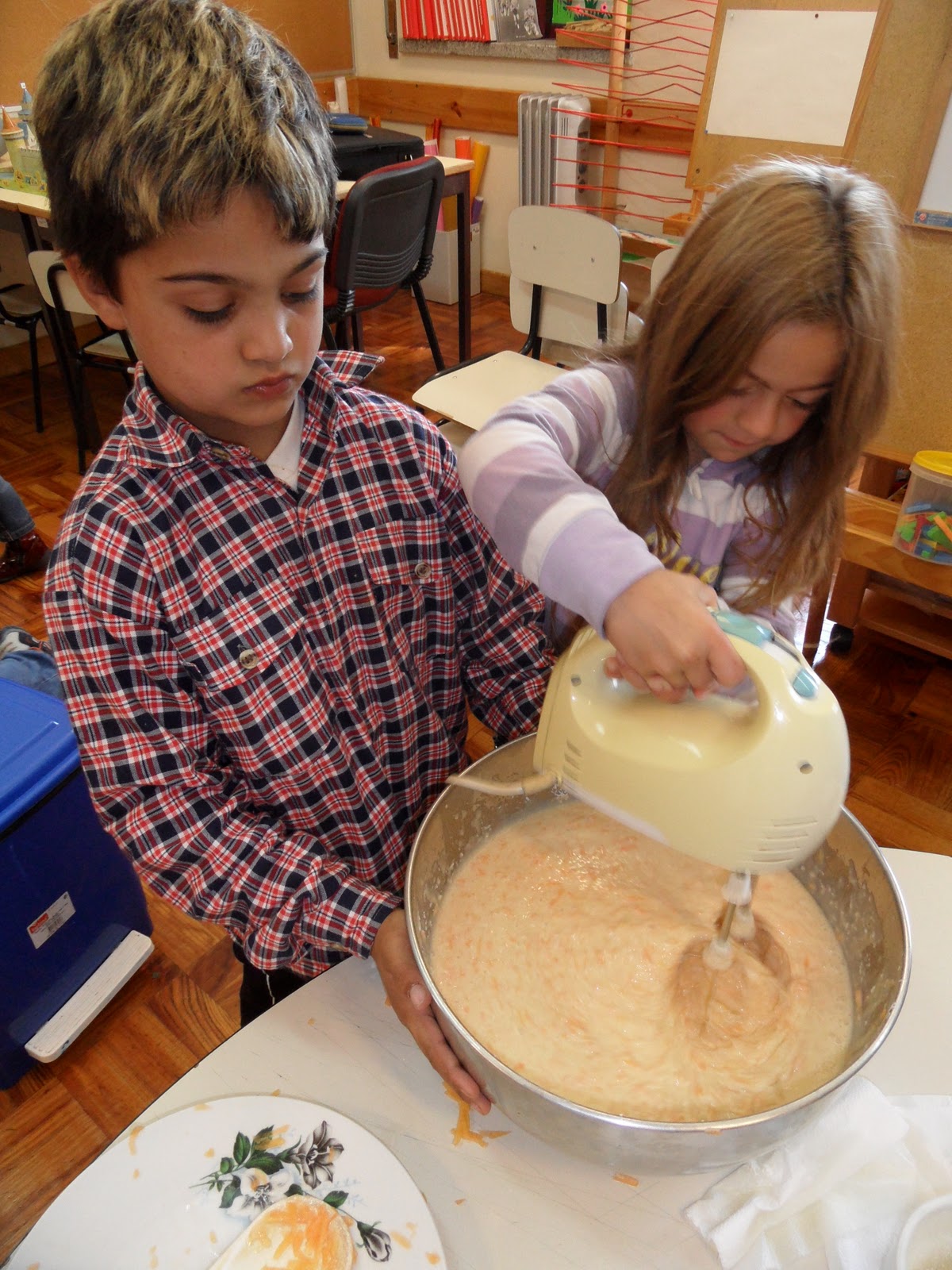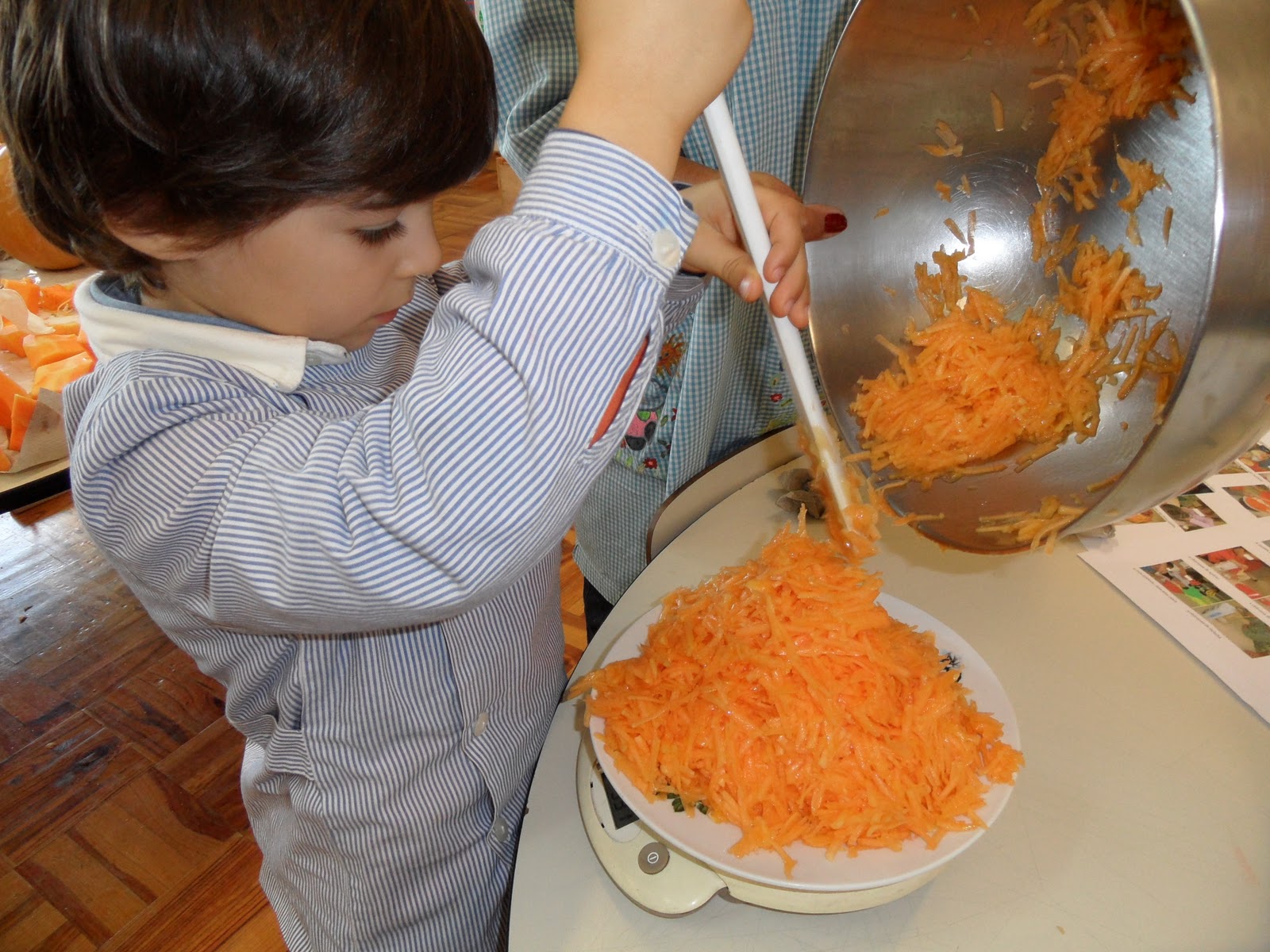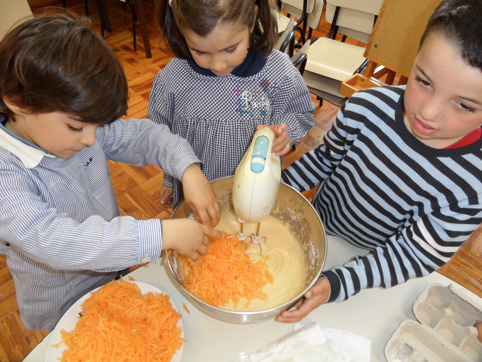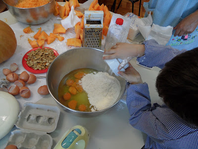 Depois da abóbora ralada pelos meninos e meninas (que era o mais complicado) ficámos preparados para fazer esta delícia - um bolo de abóbora com côco