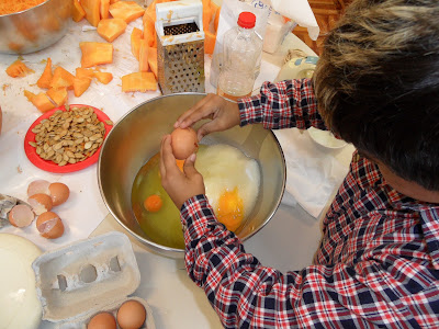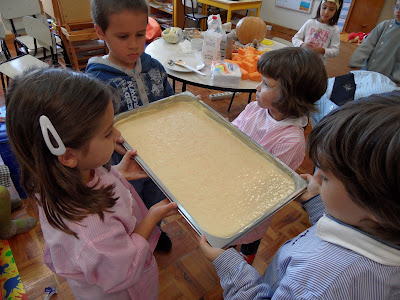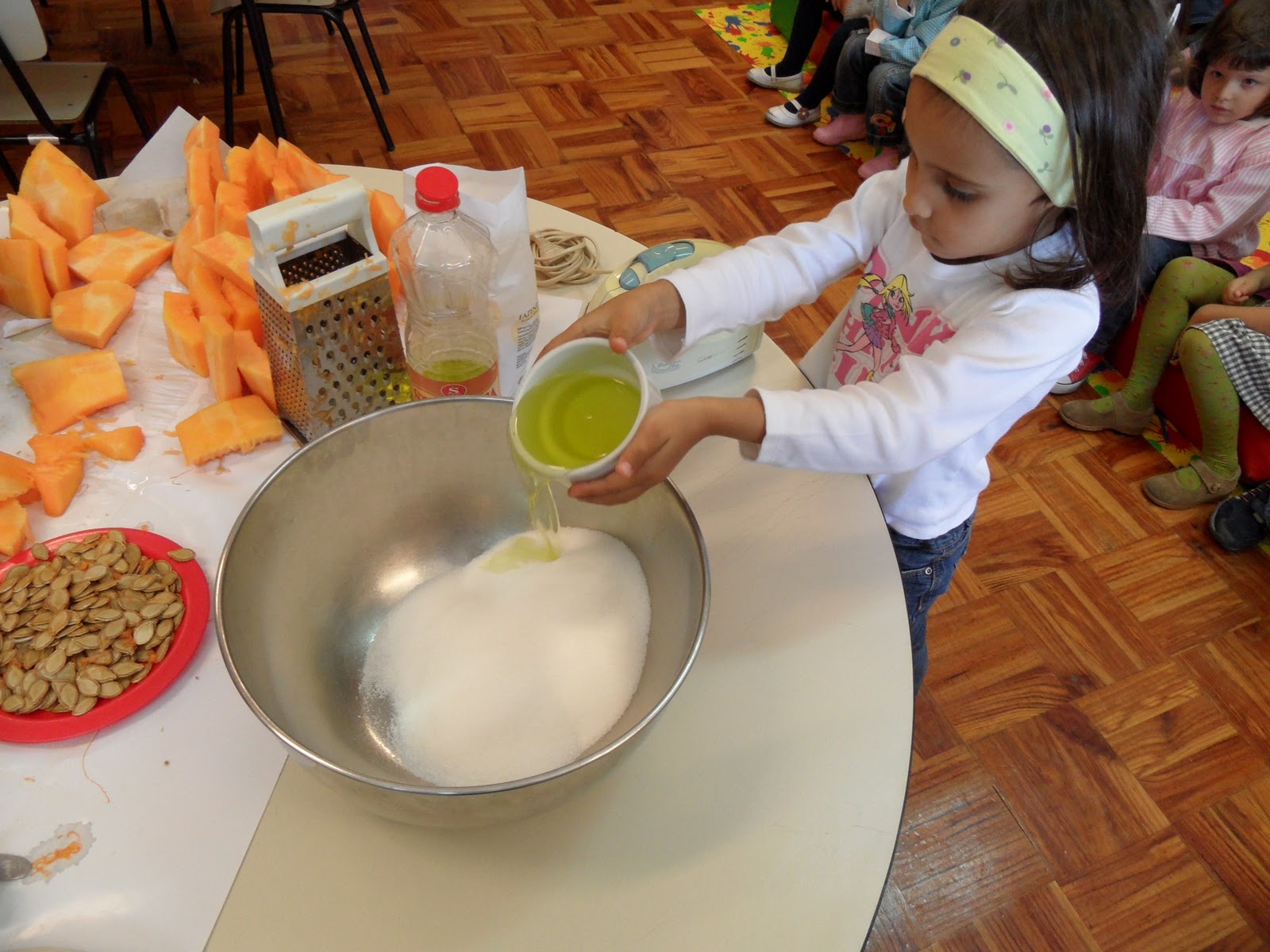Como tínhamos combinado na semana passada, hoje começámos a SEMANA DA ALIMENTAÇÃO com a realização de um bolo feito com um fruto do Outono - a abóbora.