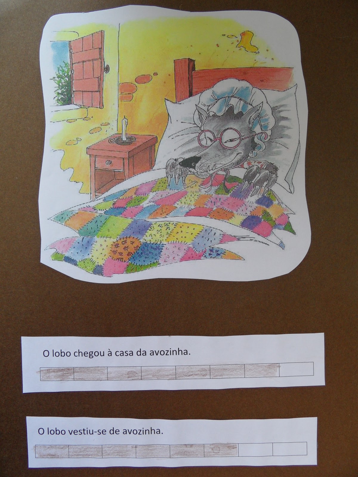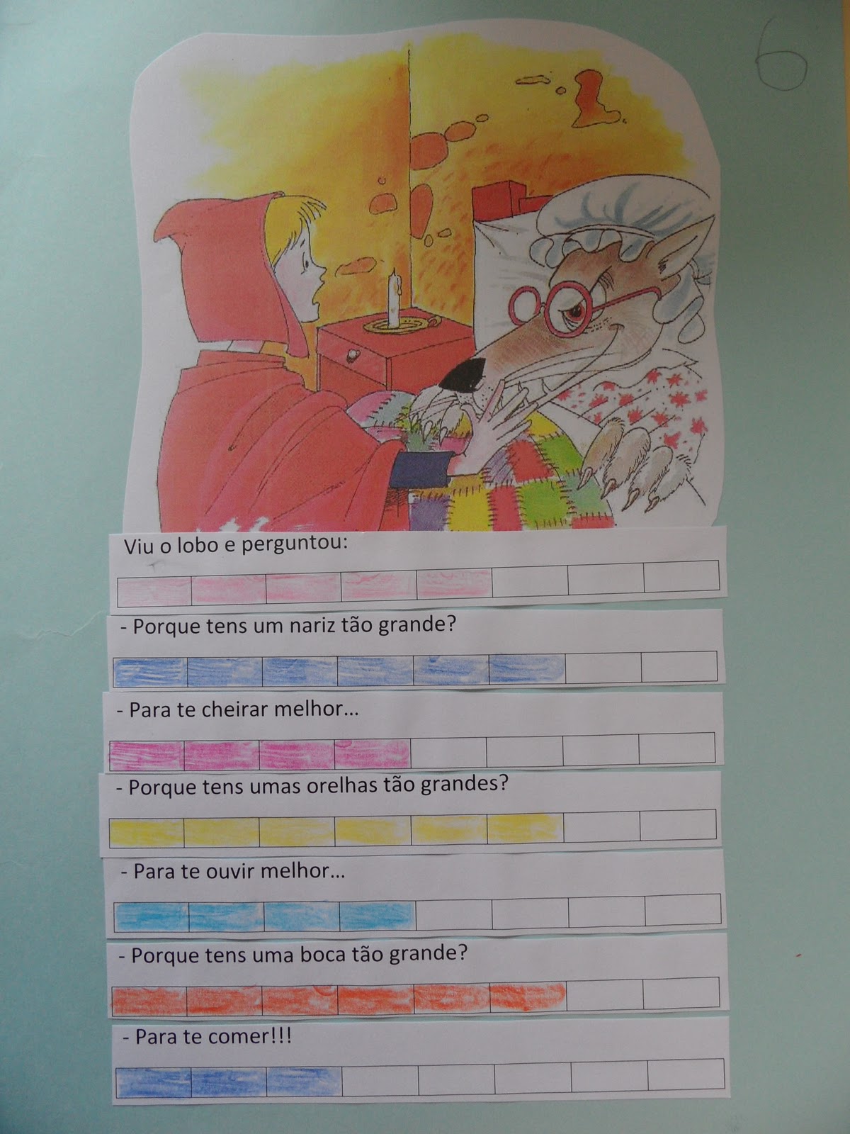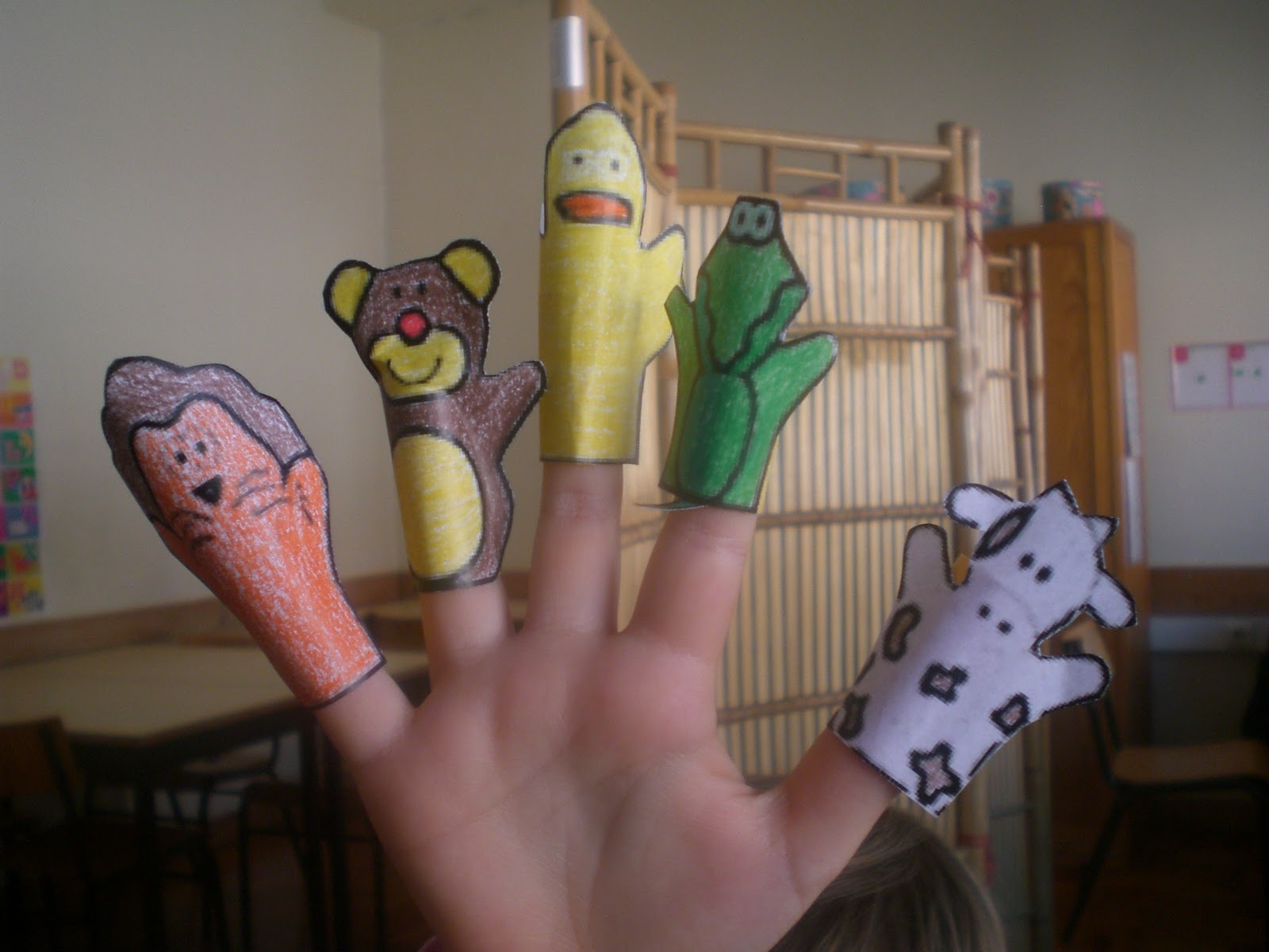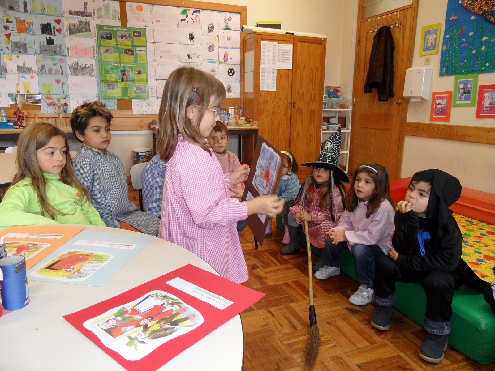 Então, e porque estamos a lidar com crianças do pré-escolar, que querem mesmo é aprender, mas a brincar, inventam-se brincadeiras com fantoches de dedos, contam-se histórias com bonecos feitos com rolos de papel, mas também se brinca aos professores e alunos com fichas de trabalho giras e cheias de figuras engraçadas. Aqui estão algumas fotografias: